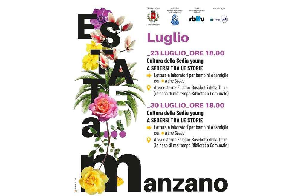 Mercoledì 23 e 30 luglio 2025 alle ore 18.00 presso l'area esterna Foledor Boschetti della Torre a Manzano ci sarà l'appuntamento con Letture e laboratori per bambini e famiglie con Irene Greco.